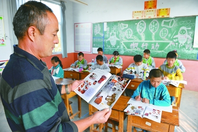山東省日照市五蓮縣叩官鎮北回頭小學的韓德智老師,在給五年級的學生上美術課。在韓德智所在的學校,每一名老師都是身兼多職。他除了擔任班主任外,還承擔著語文、美術、體育、信息、品德和綜合實踐課程的教學任務。光明圖片/視覺中國