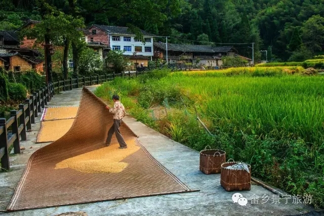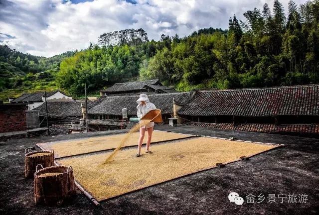 假如你錯過了去看稻田的秋收,那就來村里看曬谷場的秋曬吧。天氣晴好,畬鄉傳統的農家稻谷晾曬也是一道美麗的風景。