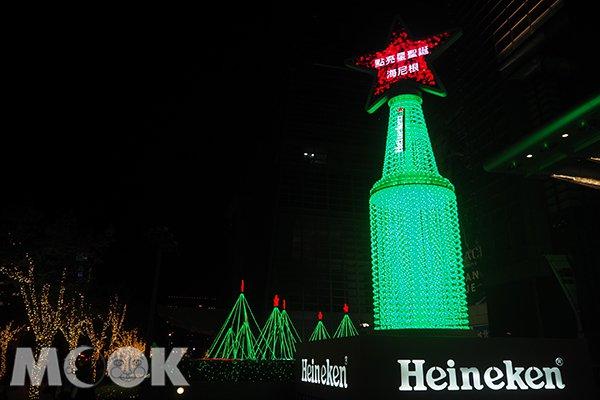 佇立在101旁的海尼根酒瓶圣誕樹