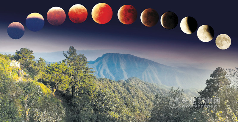 2014年10月8日,在石耳山頂拍攝的月全食、“紅月亮”(合成)