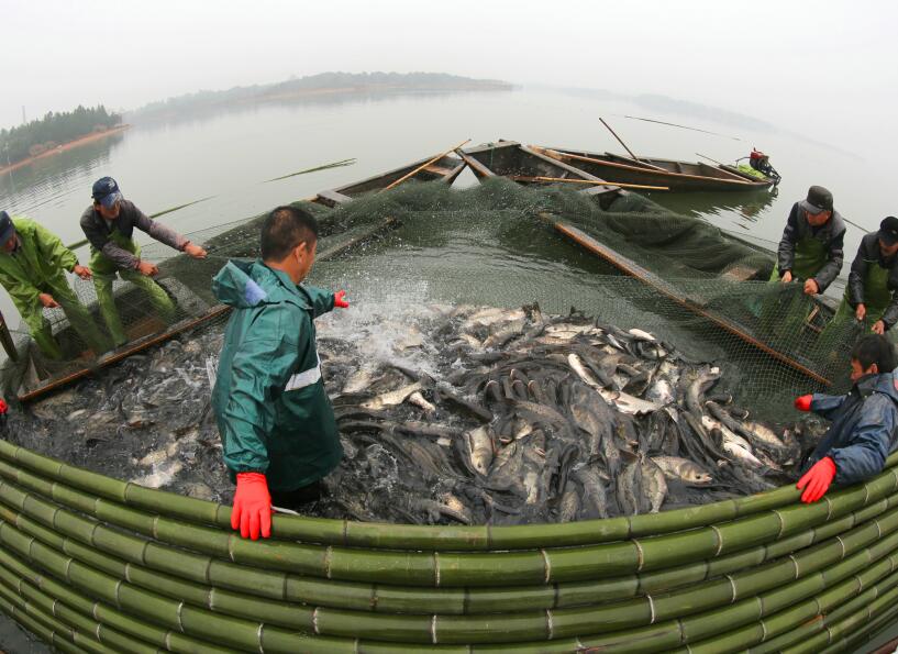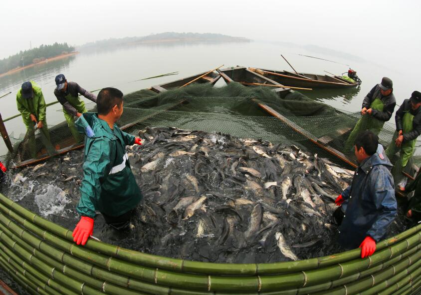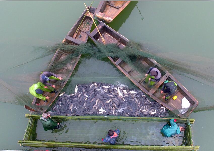 2017年1月19日,在浙江省安吉縣天子湖鎮天子崗水庫里,幾名捕魚隊員高興地托起今年首批捕獲的大鰱魚。當日上午,承包戶組織專業捕魚隊員對承包的水庫魚進行拉網冬捕,一條條裝滿鮮魚的船倉劃上岸,呈現魚肥人歡的喜人景象。據了解,該批鮮魚是最近3年來首次大規模的捕撈,將達到30萬斤,捕撈上來的魚將直接供應上海、杭州等地的春節期間市場,讓外地市民可以品嘗到安吉綠水青山養育出的魚。