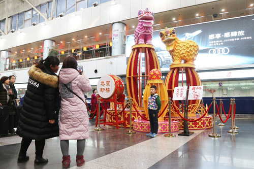 首都機場在三座航站樓的出發大廳中央位置,均布置了春節主題的大型景觀:1號航站樓的“新春 禮花”以節日焰火為創意點,用彩色流暢的線條勾勒出一朵朵綻放在空中禮花,絢爛美麗;2號航站樓的“獅舞 祥瑞”,以舞獅為創意點,兩只可愛的五彩獅子,傲立于梅花樁上;3號航站樓“種”上了兩棵與眾不同的桃樹,滿樹的桃花閃閃發光。此外航站樓內問訊柜臺、連廊都裝飾上了花瓣貼膜,為旅客出行增添了濃濃的新春氣氛。
