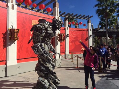 電影《功夫熊貓》的阿寶和悍嬌虎在現(xiàn)場和小朋友親切互動和拍照,尤其特別的是環(huán)球影城讓會講普通話的威震天,現(xiàn)場和游客合影和打招呼,這個高約3.66米的威震天機器人可不像阿寶那么人畜無害,而是毒舌派。它會現(xiàn)場用普通話嗆游客的“頭發(fā)顏色難看”、“拍照姿勢老土”,“為什么來這里看它,不是去中國看它”,“趕緊拍完,回家還要包餃子呢”,還得意洋洋的表示“反正你們也聽不懂我講什么”,如此個性化的對白讓不少中國游客都覺得新鮮有趣、夠另類。