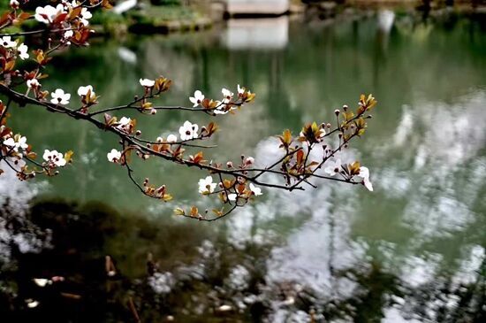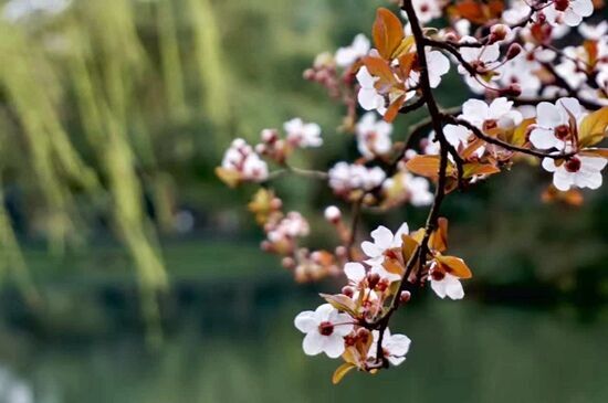 爛漫的紫色二月蘭肆意地成片開放,潔白的白玉蘭還在春風中舞動著花瓣,隨風飄落,洋洋灑灑鋪滿了翠綠色的草地。不遠處一片白色的小花,滿樹滿枝地開放的,似梅?似杏?似桃?都不是,白色的小花朵在嫩紅色的嫩葉陪伴下,一起在春雨中自由歡笑,隨風飄動,走進一看,原來是紅葉李在春雨中悄然綻放,白白的小花瓣下有暗紅色的花萼襯托著,嫩紅色的春葉似一位位護花使者,呵護著純潔嬌小的花瓣,依伴著左右,嫵媚動人。