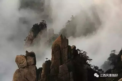 煙雨中的三清山有一股說不出的豪氣。遠山在云煙中忽現忽隱,山崖峭壁滿是落泉飛瀑,有的緩緩掛壁,跌宕有致,婉如裊裊的飄帶,消逝在煙靄中。風雨雷電造就了三清山的豐姿,惡劣的自然環境愈襯出三清山的神采,而只有櫛風沐雨,執意地追求,才能真正地領略它。