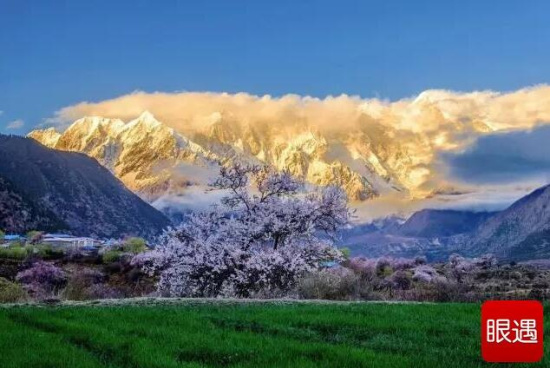看那盛開的桃花與高聳入云的雪峰連成一片,好一派“雪域江南”的奇景,比之蘇杭的桃花更顯韻致。