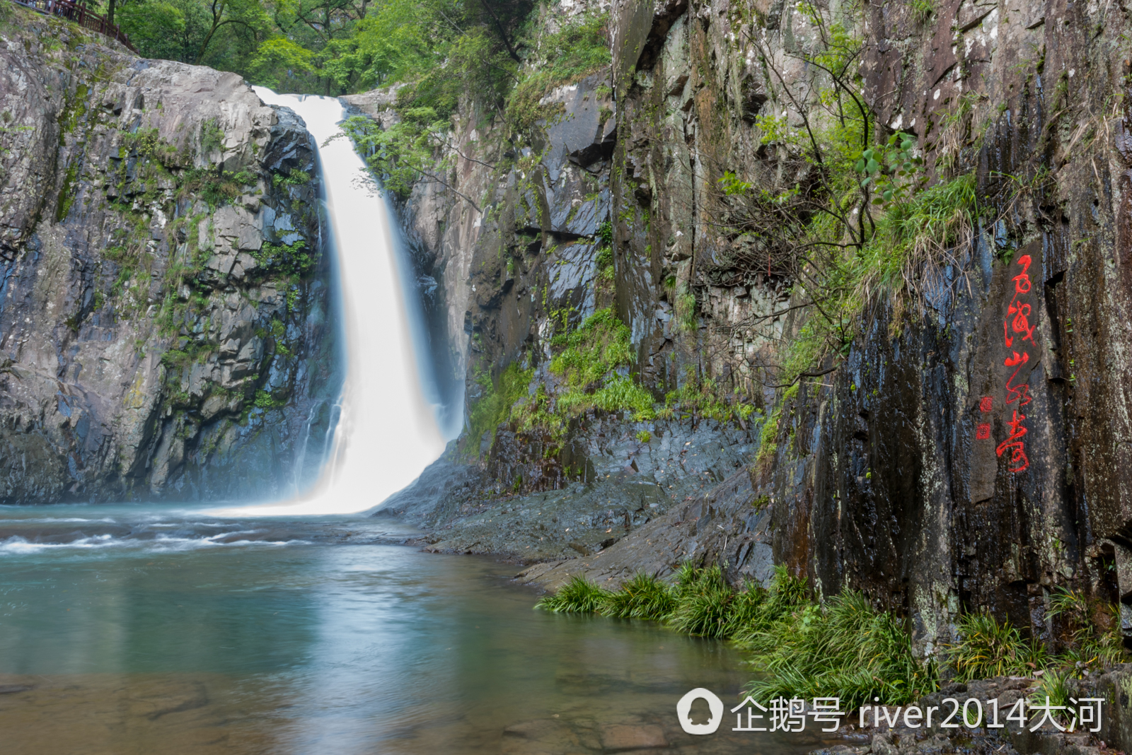第五洩是最先見到的,從31米高的山崖上狂奔而下,勢若奔雷,激起的水霧噴出去好遠,飛瀑沖激所成之潭稱為“東龍?zhí)丁薄?/p>