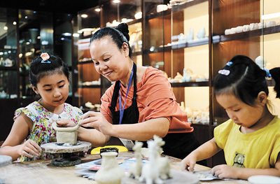 9月1日,杭州工藝美術(shù)大師紅梅(左二)教小朋友制作藝術(shù)陶瓷。新華社記者 李 響攝
