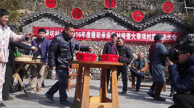 2016年2月,嶼頭鄉(xiāng)布袋坑村用竹籃當票箱、花生來計票的方式對2016年度承諾的重大事項進行表決。