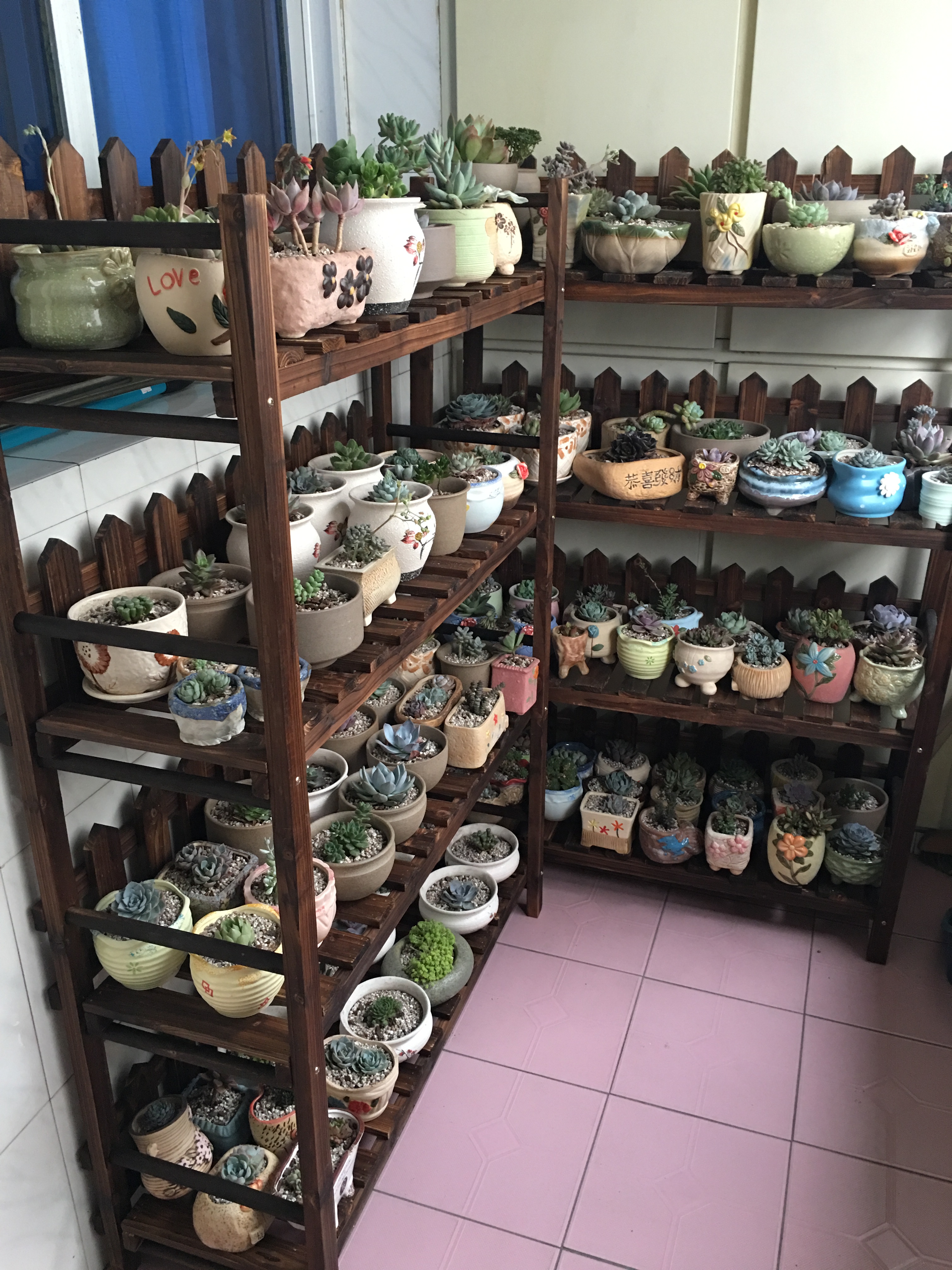 愛多肉的心從此一發(fā)不可收拾,并迅速演變成實際行動——惡補多肉知識,當當書店里買的最多的除了一直就摯愛的文學作品、歷史書籍外,又多了關于多肉種植的書;不斷搬多肉回家,花市上買、淘寶上購、朋友處換,至今已擁有近500盆100多個品種,陽臺窗臺桌臺全都被肉肉占領;努力讓肉肉看上去更美,淘來各種花盆,讓它們在造型和風格各異的盆里安家生長……