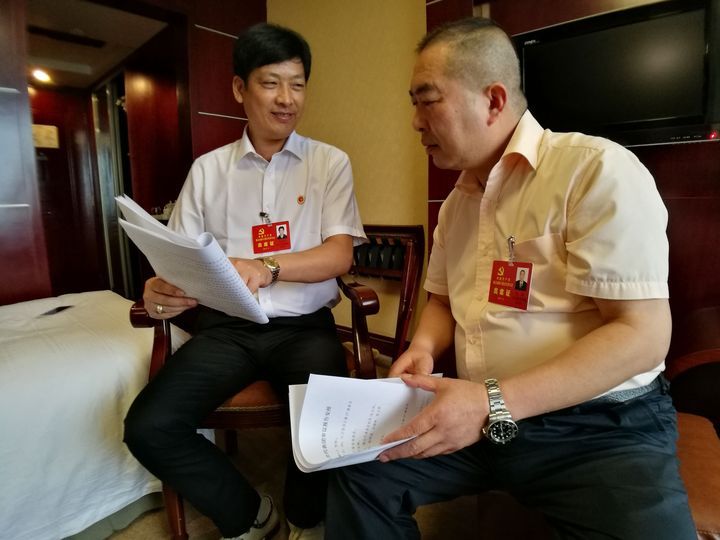 陳宏定(左)和其他黨代會(huì)代表一起討論報(bào)告內(nèi)容。
