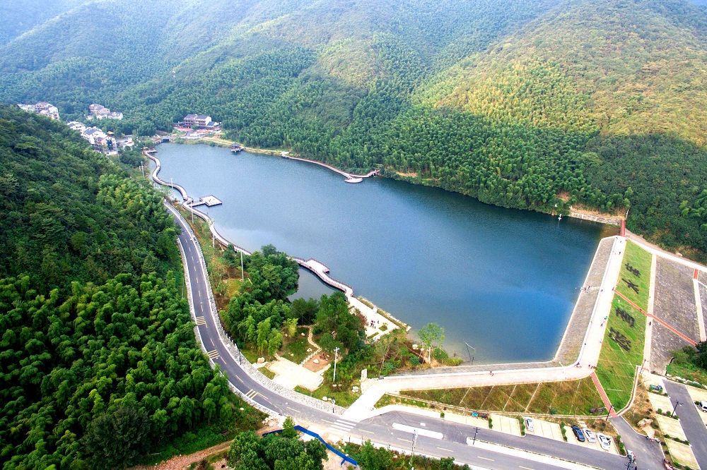 10月9日,夕陽下的長興縣水口鄉(xiāng)顧渚水庫掩映在一片青山綠樹之間,美不勝收。