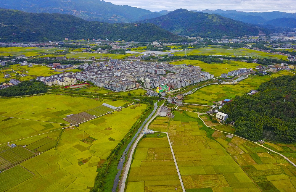 10月17日,蒼南縣觀美鎮(zhèn)中嶼村,金色稻谷把田園、村莊點綴得宛如一幅絢麗多彩的畫卷。