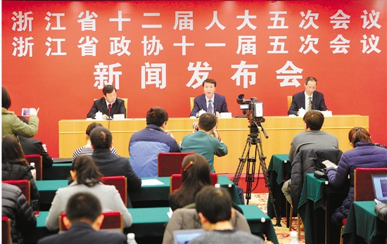 1月13日上午,2017年省兩會新聞發布會在省人民大會堂舉行。圖為新聞發布會現場。 浙江日報 記者 倪雁強 張迪 吳元峰 攝