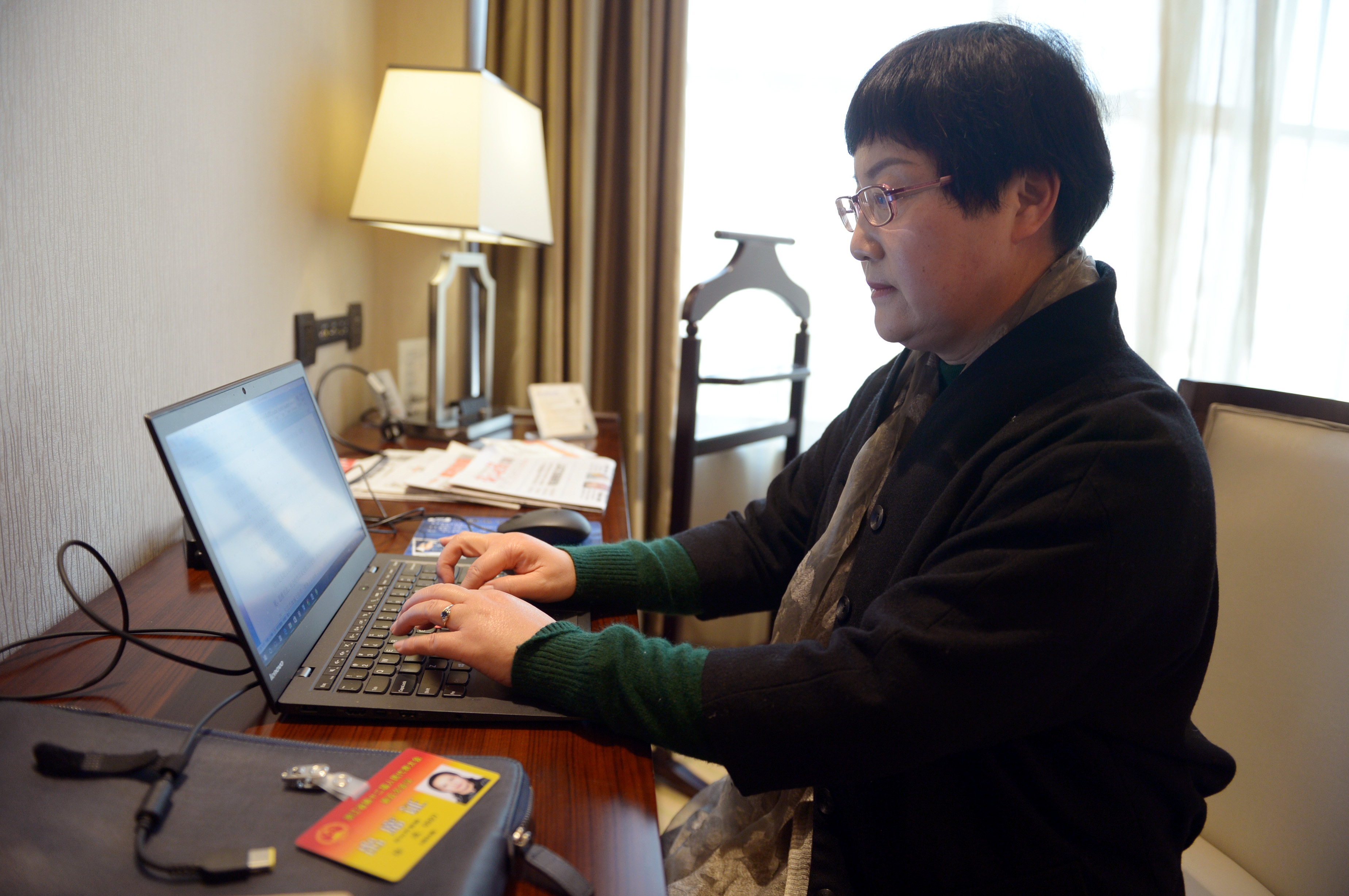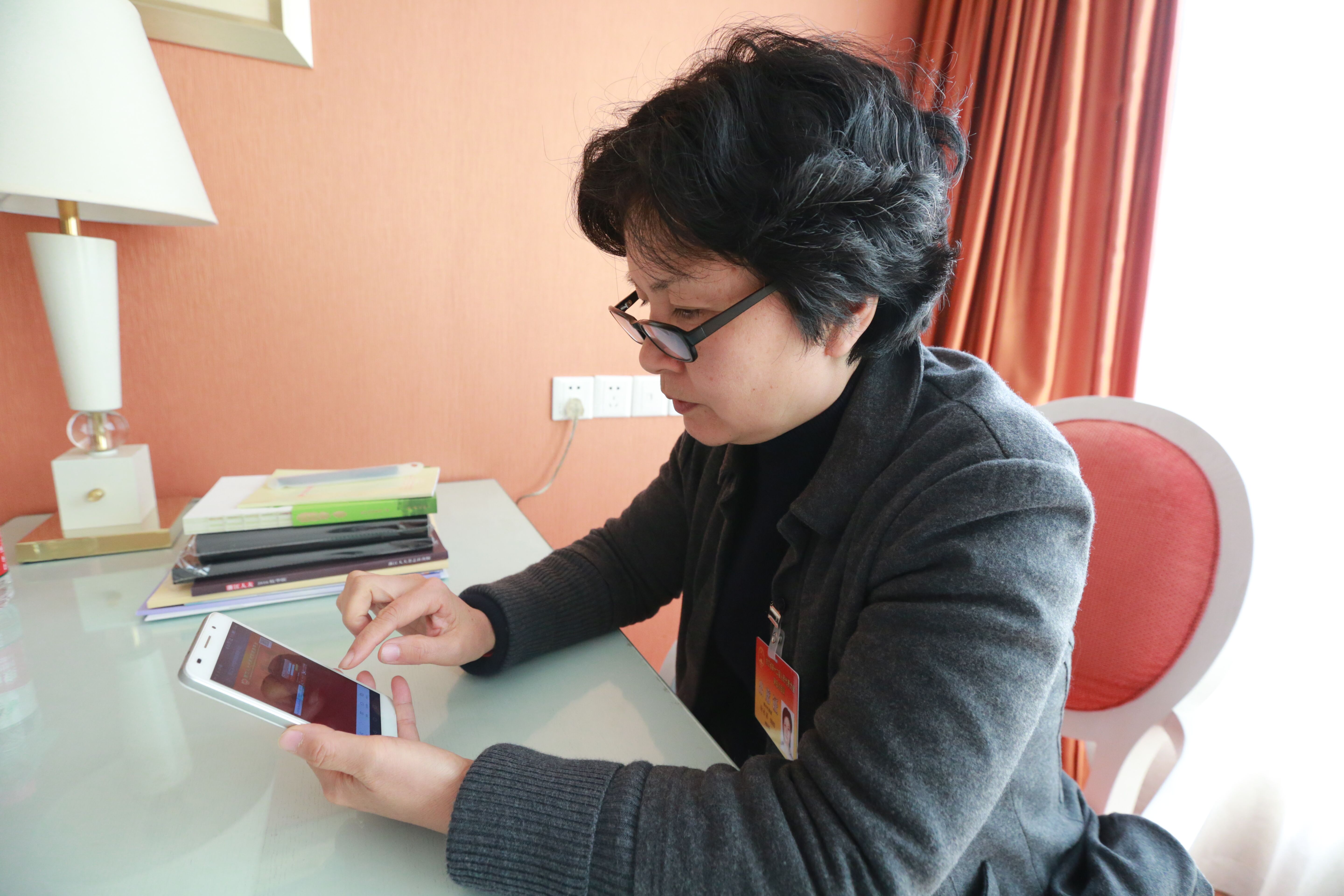 省人大代表徐永麗辦完報到手續后就拿出手機登錄網上履職平臺開始工作。