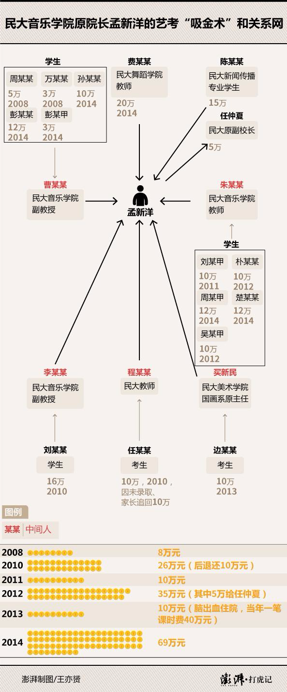 澎湃新聞記者獲得的司法判決書顯示,2008至2014年,孟新洋共接受民大5位教師請托(其中包括時任民大美術學院國畫系主任買新民),幫助13位考生通過音樂學院專業考試,累計受賄123萬元。此外,孟新洋還曾受賄20萬元,幫助一位民大舞蹈學院教師調入音樂學院。