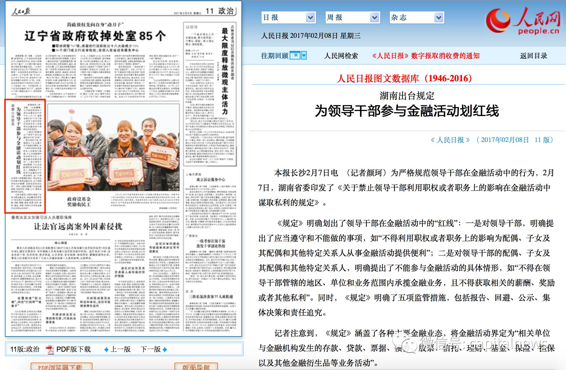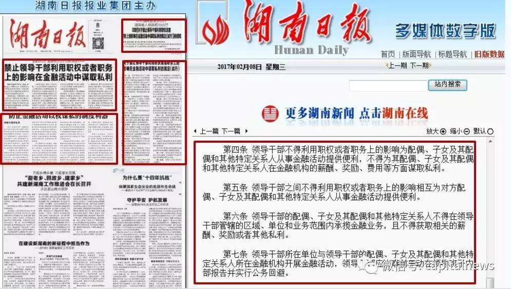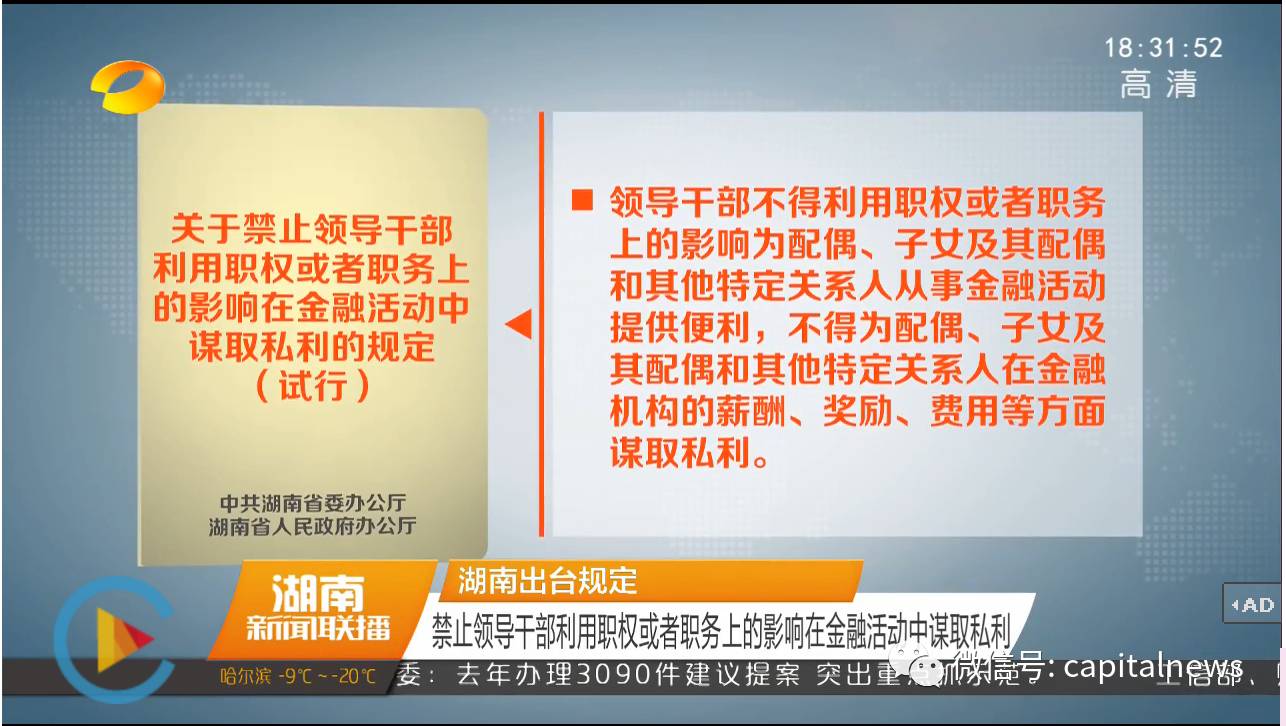 近日,《湖南日報》的頭版用了半個版、4篇稿來報道一份重要文件,叫作《關于禁止領導干部利用職權或者職務上的影響在金融活動中謀取私利的規定(試行)》。