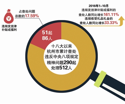 日前,市紀委發布通報顯示,黨的十八大以來,杭州市累計查處違反中央八項規定精神問題290起,處理512人。其中,違規發放津補貼或福利的有51起86人,占查處問題總數的17.59%,在違紀問題的類型中居于第二位。違規發放津補貼或福利、違規收受禮品禮金問題仍然突出,查處人數出現不降反升現象,2016年1-10月查處人數同比分別增長161.11%和33.33%。