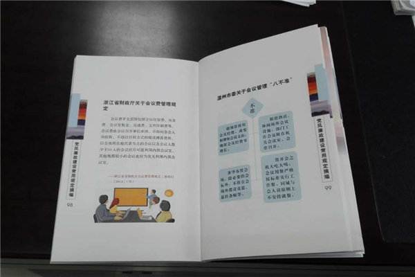 “口袋書”雖小,裝著的廉政學問可不少。翻開該書可以看到,有關黨風廉政建設制度規定等枯燥乏味的文字轉化為精練的文字和簡明的圖表,圖文并茂地說明了“兩個責任”、作風建設、廉潔自律和廉政風險防控、差旅會議管理等需要注意的問題,形象生動,通俗易懂,讓黨員干部對各項規定一目了然,明確“紅線”,可對照廉政規定指導、規范自身從政行為。