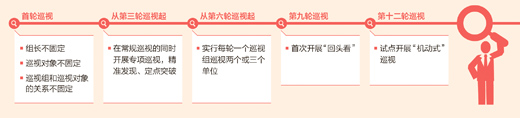 2014年3月啟動的中央第三輪巡視對科技部、復旦大學、中糧集團開展了專項巡視,以問題為導向,形式更為靈活,哪里問題多、哪個部門問題多,就往哪投入更多力量。在多輪試點的基礎上,2015年的第六輪全面推開專項巡視。2016年起,中央巡視組又推出了巡視“回頭看”,先后對16個省區市殺了“回馬槍”,占31個省區市和新疆生產建設兵團總量的一半,不僅檢查上輪巡視發現的問題是否整改到位,還查找新的問題線索,強化問題導向,起到強烈震懾作用。第十二輪巡視又選擇4家中央部門開展“機動式”巡視,更加機動靈活,發揮“流動哨”的作用,發現“燈下黑”問題,形成有力震懾。