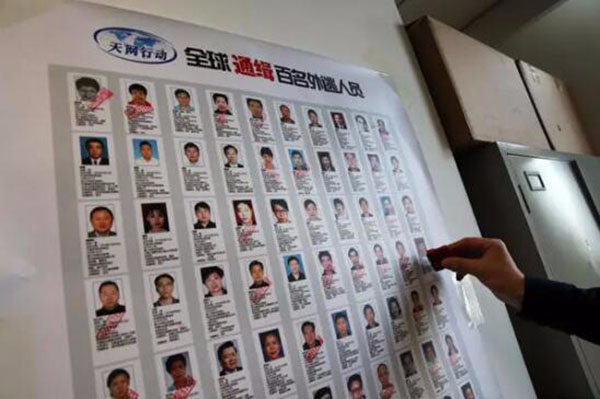 中央追逃辦里掛著的“全球通緝百名外逃人員”名單。