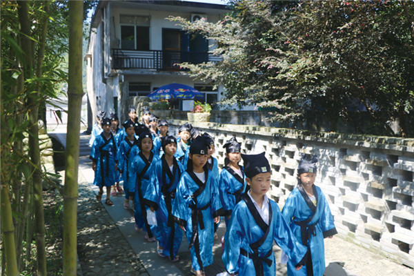 鼓樂聲響起,來自沙灘村和上鳳村的21名孩子身著漢服,翩翩有序地步入文化禮堂。站畢,正衣冠,隨后,孩子們雙手交疊,舉手加額,面對村里的長者揖禮鞠躬九十度,行“拜禮”。行禮后,孩子在輔導老師的帶領下,開始誦讀經典。