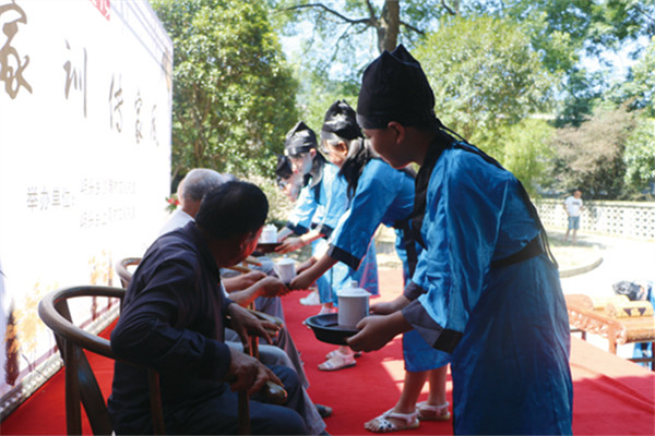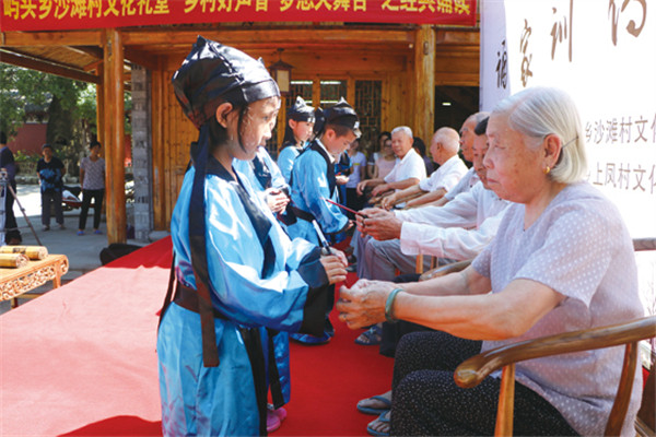 此次誦家訓傳家風活動,受邀參加的長輩是村里一些有名望的長者。孩子們誦讀經典之后,還為長者們敬茶。喝了孩子們奉上的茶,長者們為孩子們授筆。孩子們恭敬地接過筆,鞠躬表示感謝。活動現場還有不少家長“旁聽”。其中一位家長陳女士在接受采訪時說道:“從小接受道德教育很有必要,對孩子們的成長是大有好處的。‘孝’字當先,我們家長首先要言傳身教、以身作則,在家庭里對老人盡孝盡心,這樣孩子也會主動向家長學習,成為知曉仁義的孩子。同時這也讓我們家長上了一課。”