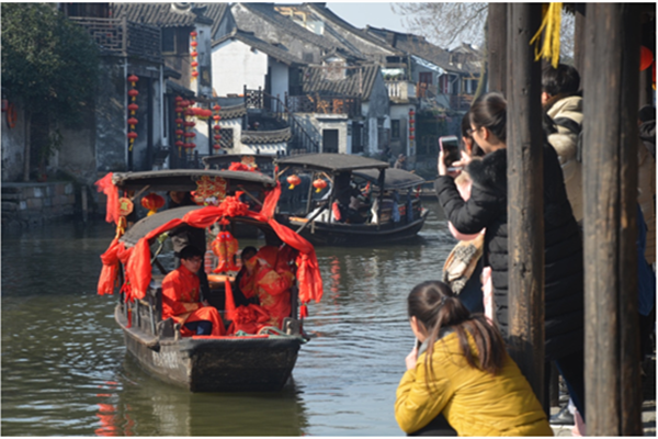 每年春節(jié)前后,嘉善西塘古鎮(zhèn)都會(huì)舉辦水鄉(xiāng)婚禮民俗表演,在儀仗隊(duì)歡快的樂曲聲中,“新人”將乘坐水鄉(xiāng)小舟,沿著悠悠的水巷來到人聲鼎沸的河兩岸分發(fā)“喜糖”,向節(jié)日期間的游客生動(dòng)還原展示江南水鄉(xiāng)民風(fēng)民貌。