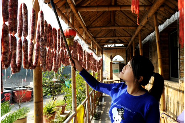 在一些地方,年味兒是從曬臘味道開始的。一到臘月里,很多人家開始張羅著要灌臘腸了。金華土豬肉因肉質(zhì)酥爛,且絲毫沒有油膩而遠(yuǎn)近馳名,以此為原料加工的香腸紅白相間而油潤,逢年過節(jié)是當(dāng)?shù)夭妥郎喜豢苫蛉钡囊坏烂朗场?/p>
