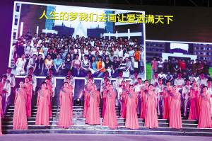 寧波大學(xué)建校30周年暨三校合并20周年主題晚會在寧大體育場舉行。圖為教工和學(xué)生合唱團(tuán)合唱《愛讓我們回家》。