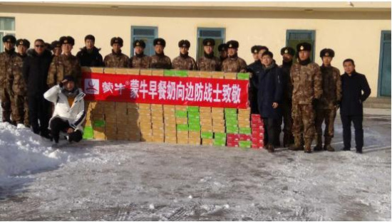 2017年2月3日,一支由蒙牛員工組成的志愿者小隊(duì)冒雪登上海拔5000米的新疆喀什解放軍某部邊防哨所,為駐守高原的邊防戰(zhàn)士送去了12000盒早餐奶。在向這些最可愛的人致敬同時(shí),也零距離體驗(yàn)了他們的日常生活。