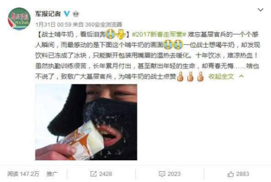 核心提示:一張邊防戰(zhàn)士啃蒙牛早餐奶冰塊的照片刷爆互聯(lián)網(wǎng),為駐守高原的邊防戰(zhàn)士送去了12000盒早餐奶,邊防戰(zhàn)士的執(zhí)勤與生活環(huán)境雖然艱難。