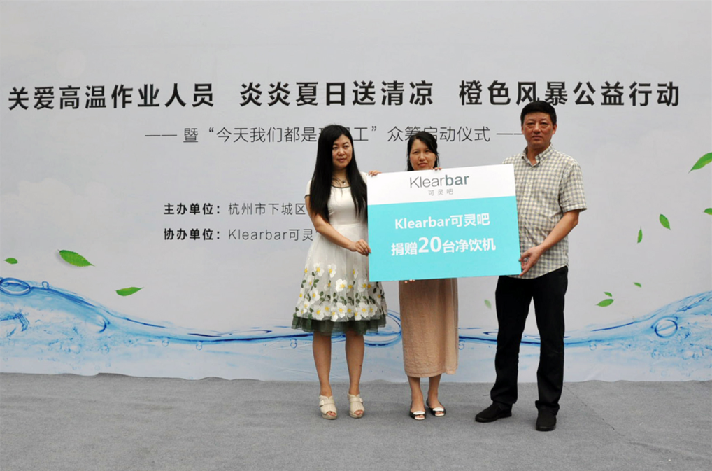 炎炎夏日,熱浪襲人,辛勤勞作的環衛工人、停車收費管理員等高溫作業人員仍堅守一線,令人敬佩。進入6月,下城區城管推出了一系列防暑降溫的措施,與浙江在線聯合發起"橙色風暴,為高溫作業人員送清涼"關愛行動。征集令一經發出,立馬得到了多方愛心企業的回應。結合此次活動,Klearbar可靈吧與鏈家地產在杭州設立30個飲水點。鏈家地產在會上表示,請環衛工人不要不好意思,歡迎他們能夠進來避避暑喝喝水,把這里當成自己的家。