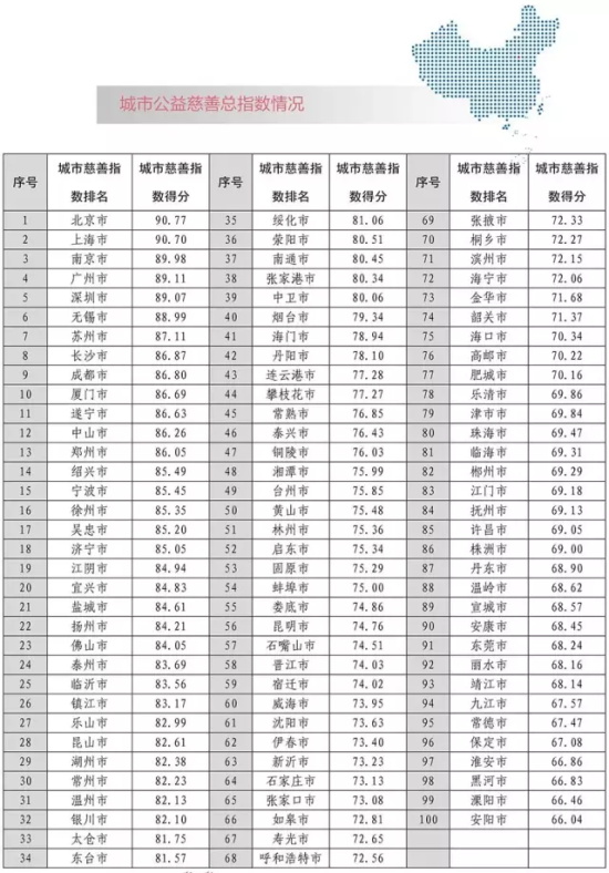 “中國城市公益慈善指數”發布 京、滬等位居綜合指數前列