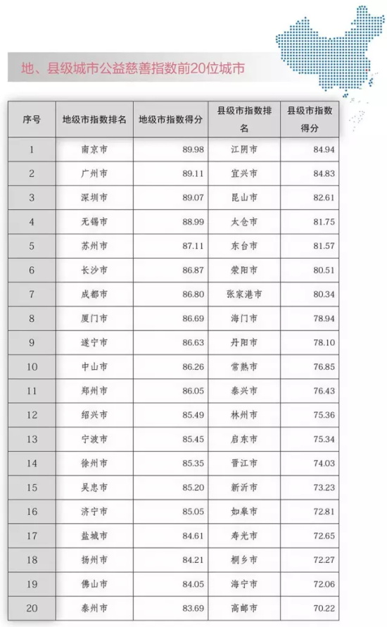 地、縣級城市指數(shù)得分前20城市的平均得分分別為86.33和77.24,地級城市整體慈善事業(yè)發(fā)展情況好于縣級城市。