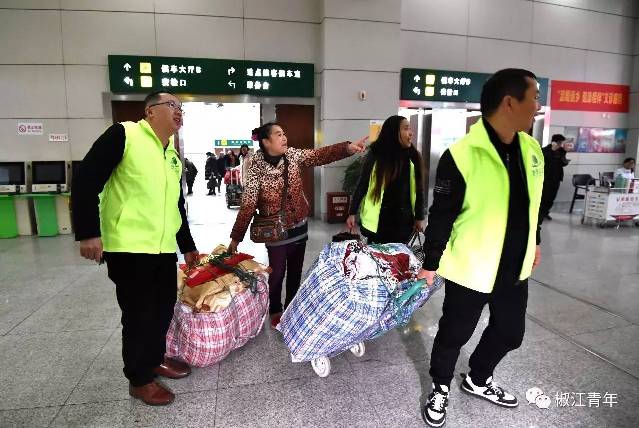 春運回家,每個人都是滿滿的行李年貨,拎不過來,沒關系,志愿者幫你提,穩妥地送你上車,是不是有很愛?