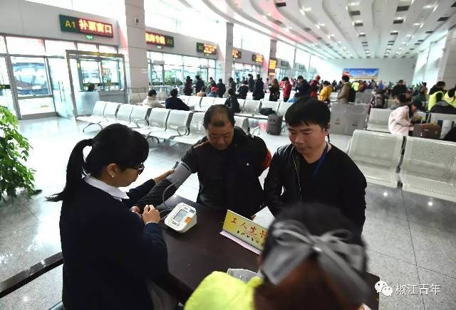 義診服務臺的志愿者都是來自臺州中心醫院、萬康醫院的醫生護士,在為旅客測量血壓的同時也提供健康咨詢服務,