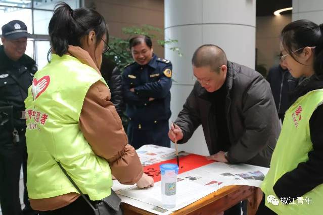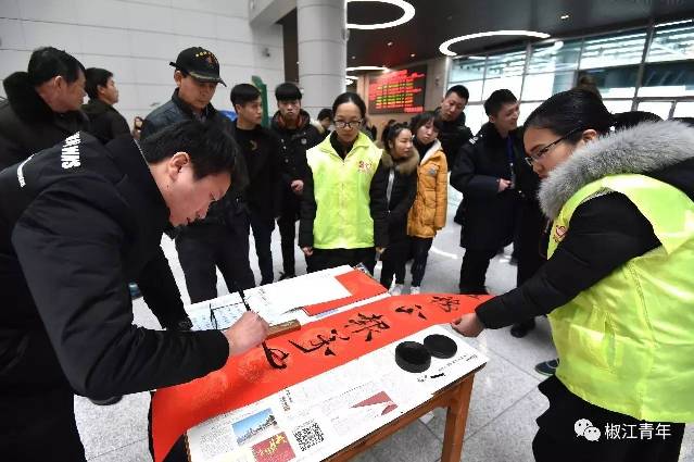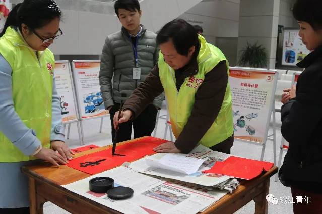 椒江區青少年宮、椒江二中及椒江區交通局的志愿者現場揮毫,為旅客們書寫春聯。