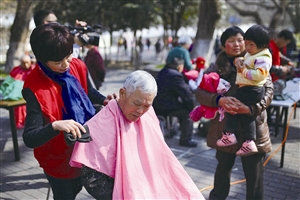 小草志愿服務隊成員在幫老人理發