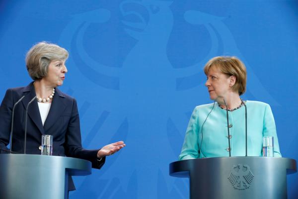 英國新女首相特蕾莎·梅訪問德國,首次以首相身份同德國總理默克爾舉行了會談。 視覺中國 圖