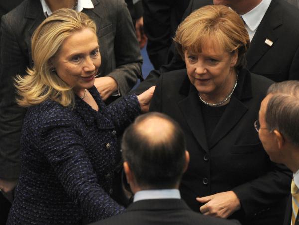希拉里與默克爾在德國波恩舉行的“阿富汗會議”上,攝于2011年12月5日。