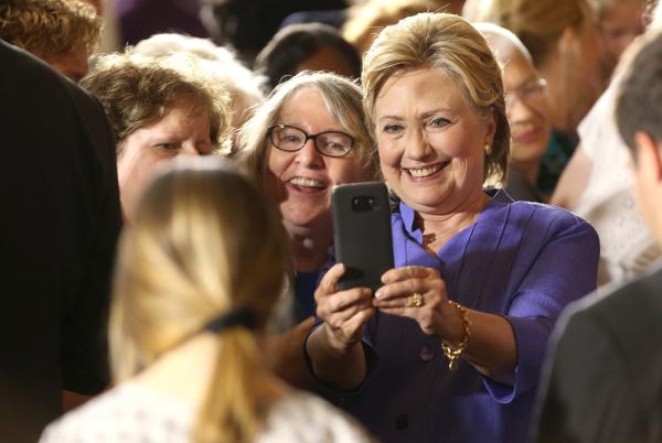 當地時間2016年6月27日,美國俄亥俄州辛辛那提,美國民主黨總統候選人希拉里舉行競選集會。圖為希拉里與民眾玩自拍。 東方IC 資料圖