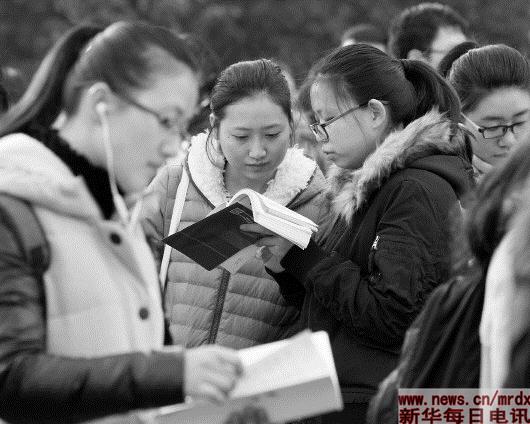 11月27日,考生們在南京林業(yè)大學(xué)考點等候進場時復(fù)習(xí)。