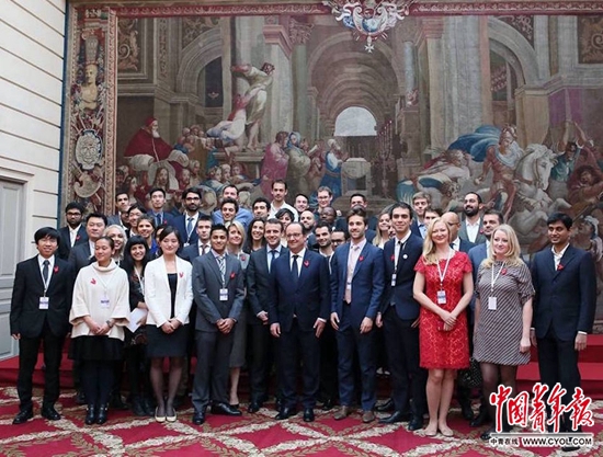 2016年3月,楊倩等首屆“法國(guó)科技之門”全球創(chuàng)業(yè)大賽獲獎(jiǎng)?wù)咴趷埯惿釋m受到法國(guó)總統(tǒng)奧朗德的接見。本版圖片均由陳小茹提供