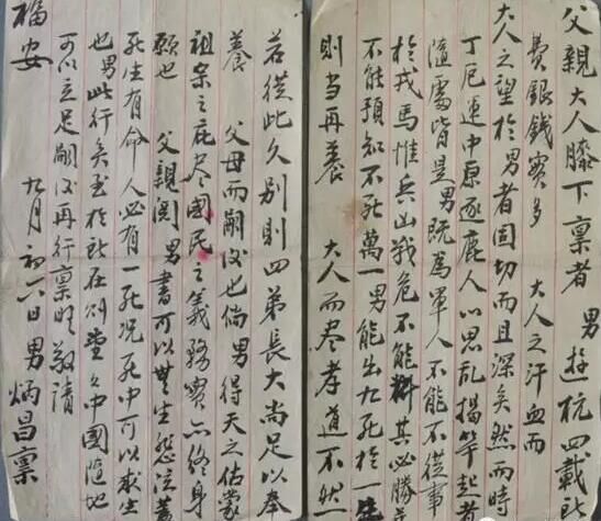 男游杭四載,所費銀錢實多,大人之汗血,而大人之望于男者,因切而且深矣。然而時丁厄運,中原逐鹿,人心思亂,揭竿而起者隨處皆是。男既為軍人,不能不從事于戎馬,惟兵兇戰危,不能料其必勝,亦不能預知不死。萬一男能出九死于一生,則當再養大人而盡孝道。不然,若從此久別,則四弟長大尚足以奉養父母而嗣后也。徜男得天之佑,蒙祖宗之庇,盡國民之義務,實亦終身愿也!