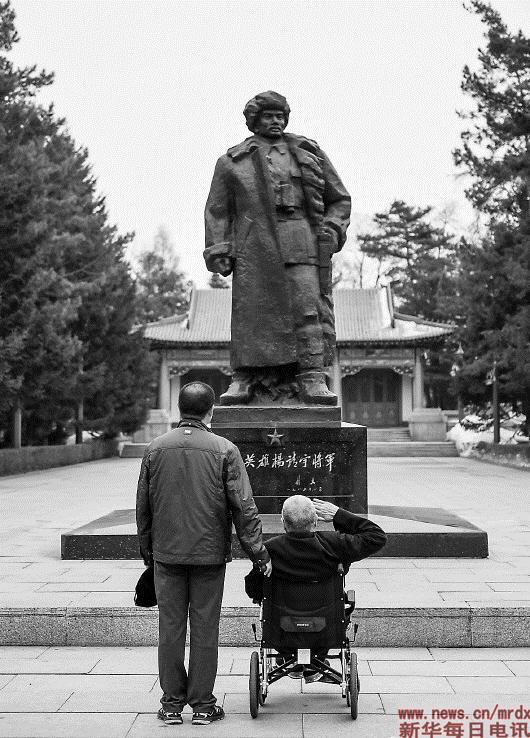 徐振明(右)和兒子徐永軍在通化市靖宇陵園向楊靖宇雕像致敬(3月17日攝)。新華社記者王昊飛攝