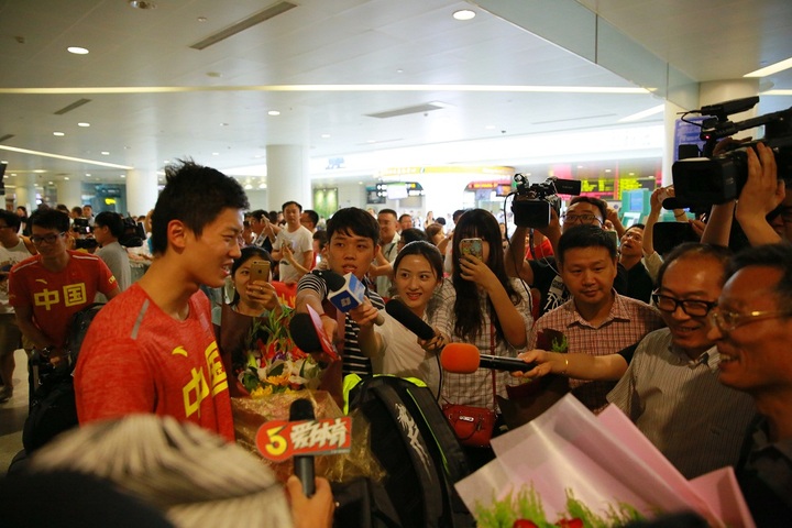 比預(yù)定的時間要晚,下午兩點半朱志根師徒四人才陸續(xù)出現(xiàn)在國內(nèi)到達出口。經(jīng)歷了長途飛行之后四人的臉上寫滿了疲憊。在里約奧運男子200米混合泳比賽中上演大逆轉(zhuǎn)斬獲一枚寶貴銅牌的汪順推著行李走在最前面,一出現(xiàn)便被媒體、粉絲團團包圍,迎面送來的鮮花更是將他堵了個滿懷。