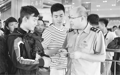 孫萬斌(右一)在車站為乘客答疑解惑。 資料圖片