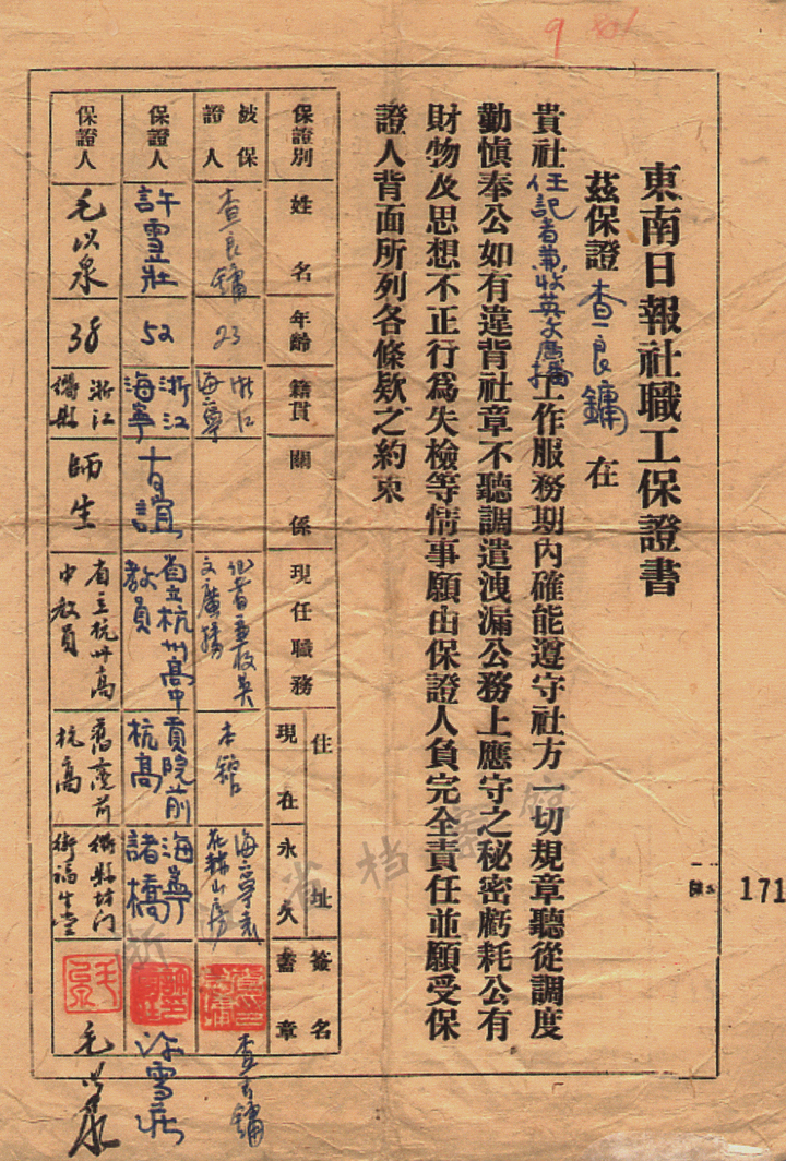 東南日報社職工保證書 浙江省檔案館供圖