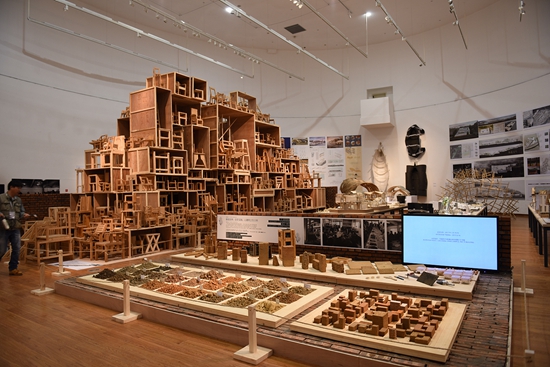 王澍要求學生必須動手,甚至是親手堆夯土,因為“拿一把土在手上,和在紙上寫下‘土’字,完全是兩回事”。在本次展覽的顯眼位置,有一座高至天花板的“椅山”。王澍要求一年級新生上木工課,學榫卯,期末每人做一把椅子——不是模型,是實實在在的一把木椅子——能坐的那種。10年下來,學生的椅子堆成了山。